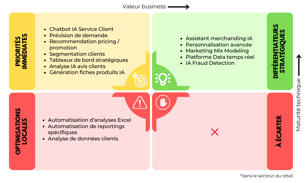 Les objectifs flous freinent l’innovation. Nous traduisons vos enjeux métiers stratégiques en projets techniques précisément cadrés, pilotés par le ROI. Nos priorisations s’appuient sur l’évaluation de la faisabilité et de l’impact.